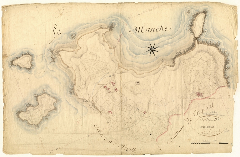 Au sud du port de Landrellec, on peut remarquer des traces de travaux d'exploitation sur l'estran et sur l'île Plate (à l'ouest), une exploitation sur l'estran sud (rochers altérés isolés), plus intense sur l'estran nord ; des excavations sont présentes sur le haut de l'île. L´île Plate, avec ses rochers de granite bleu et ses galets découverts à marée basse rattache Morvil à la presqu´île de Landrellec. Elle est bosselée par les vieilles excavations. Sur l´estran, il n´est guère de rochers travaillés qui ne gardent la trace des trous pour les coins en bois. L´île Morvil à l'est de l'Île Grande s´avance vers la mer comme l´étrave d´un navire. Les galets, bien qu´il s´agisse d´un granite à mica noir, sont tout blancs à force d´être roulés par la mer.