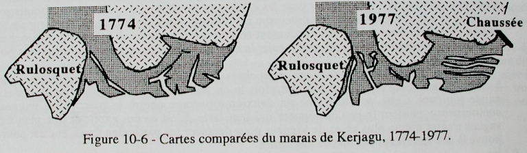 La carte des Ingénieurs Géographes datée de 1774 permet de constater l'évolution des marais littoraux de l'Île Grande, en particulier les marais de Kerjagu et de St-Sauveur. Cette carte dessine un réseau d'étiers, avec laquelle on peut comparer la photographie aérienne de 1977, la dernière avant la marée noire du navire "Amoco-Cadiz. Outre les transformations du front du marais, on observe, en considérant ces deux cartes, que plusieurs étiers ont changé de place, les méandres s'étant déformés, mais surtout que de nouveaux étiers sont apparus. Ils sont tous liés à la création de chemins à travers le marais, et en particulier, la formation de trois étiers parallèles alignés selon un axe Rulosquet - pont de l'Ile-Grande. Le témoignage d'un ancien cultivateur de l'Ile Grande, daté de 1959, rapporté par le géographe J.P. Pinot : Mon père avait son exploitation près du lavoir, et des champs de l'autre côté de là où est la chaussée. Il passait donc avec sa charrette à travers le marais, en droite ligne. Mais le chemin qui s'était formé, servait d'écoulement aux eaux de marée, et il était de plus en plus profond et de moins en moins carrossable. Il l'a donc abandonné au bout d'une quinzaine d'années et a créé un deuxième passage, parallèle au premier, une quinzaine de mètres plus au sud, mais celui-là aussi s'est dégradé en 15 ou 20 ans et il en créé un troisième, encore plus au sud. C'est à ce moment là qu'on a construit la chaussée (en 1909) et qu'il a dû passer ailleurs. Selon J.P. Pinot (SMVM du TG, 1993), en 1950, l'étier plus au nord était très évolué, sa direction générale rectiligne était encore sensible sur le terrain, mais il sinuait de part et d'autre de cette direction, s'écartant parfois de 2 ou 3 m du tracé rectiligne. Il était déjà encaissé à hauteur d'homme. L'étier du milieu (plus récent de 15 ans selon cet informateur) était moins sinueux, et moins encaissé, mais depuis lors il est arrivé presque au même stade que le précédent. L'étier sud, qui avait servi de chemin moins longtemps, était encore à peu près rectiligne, et à peine encaissé. On peut constater que l'évolution a été rapide, même si, dans ce cas, l'intervention humaine a involontairement accéléré le processus. Au fond de l'anse de Saint-Sauveur, avant la marée noire du "Torrey-Canyon", la fontaine Saint-Sauveur était en bordure immédiate de la mer. On a utilisé le fond de l'anse comme dépôt de sédiments mazoutés, en 1967, et plus tard on a construit en bordure du dépôt un rempart en enrochements, très inadéquat, puisque construit avec une solidité sans objet dans un endroit aussi calme, mais laissant entre les blocs de très larges espaces par lesquels le sédiment entassé derrière, est soutiré. Le pré-salé de Saint-Sauveur était donc, en 1978, limité à une étroite bande au pied de cet enrochement, puisque la plus grande partie de son aire antérieure avait été fossilisée sous le dépotoir. Le marais s'est reconstitué grâce à l'intervention humaine, une fois le plus gros du pétrole enlevé, pour nettoyer le sol par des binages répétés, pour enfin semer et replanter. Le marais est assez bien reformé pour qu'on ait pu disposer, sur le terre-plein qui le domine, une table de pierre avec panneau explicatif en céramique.