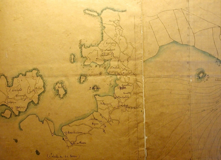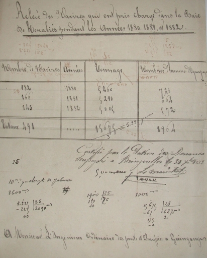 Le havre de Keralies et le port de Toëno (ou Toinot) étaient considérés au début du 19ème siècle comme des ports de relâche pour les caboteurs et borneurs de la Manche. L'Île-Grande était davantage considérée comme port de pêche. En 1896, selon le Journal de Lannion, seul le balisage flottant permettait aux navires de trouver les passes pour s'orienter vers les échouages de Toëno et de Keralies. 400 à 500 caboteurs faisaient escale dans ces modestes ports, non équipés entre 1880 et 1882, armés par 2000 équipiers, selon le rapport des ingénieurs des Ponts-et-Chaussées, Thiébaut et Guillemoto, qui commençaient à étudier un projet de balisage à partir des relevés de côte de Beautemps-Beaupré en 1837. Cependant, entre 1850 et 1914, on pouvait déplorer la perte de 38% des navires armés au transport des pierres de carrière, dont 19 corps et biens sur un total de 53 navires. La passe de "Toul Bras" permettait de rejoindre le havre de Keralies en passant entre l'île Morvil et la Roche du Corbeau, depuis la pointe nord-est de l'Île-Grande. Les navires venaient échouer à Keralies pour le transport des pierres, provenant des carrières exploitées par les habitants du village de Landrellec sur la grève. Il existait selon Ardouin-Dumazet, trois mouillages sur cette côte de Pleumeur-Bodou : Toinot, entre l'île de Fougère et Ru Cornic, Morville, près de l'île de ce nom et Penvern, entre le pont et l'île d'Aval (orthographe d'origine). En 1881, un questionnaire fut adressée au maire de Pleumeur-Bodou afin d'évaluer l'importance du port de Keralies. En 1882, les habitants de Landrellec et Roscannez pétitionnaient pour la création d'un port avec les aménagements nécessaires. Un avant-projet fut proposé sur le rocher du Rudulu en 1886 : rampe d'accès, plateforme et cale rampante, sur 40 m de longueur et une largeur de 8 m pour la plateforme et de 5 mètres pour la cale. En 1898, une pétition réclamait de nouveau un quai ou une cale débarcadère. Cependant le débarcadère ne fut pas réalisé et les navires continuèrent à décharger leur cargaison sur la grève en employant des allées charretières. Sur un plan daté de 1907, extrait du plan cadastral de la commune, section B (fig. 14), on peut remarquer la présence d'un poste de douane à la pointe sud-ouest, la digue édifiée par Guillou au fond de l'anse de Keralies et les chemins non cadastrés, soulignés d'un trait rouge. La carte récente du SHOM permet de distinguer le balisage actuel et de remarquer l'absence d'ouvrage portuaire dans la baie de Keralies. La baie de Keralies s'ouvre vers les îles d'Erch, l'île Bihan et l'Île d'Aval (la seule habitée), qui fait l'objet au cours du 20ème siècle de campagnes d'extraction. L'Île d'aval a même accueilli plusieurs familles de carriers, qui ont construit plusieurs bâtiments à usage domestique et agricole, à la fin du 19ème siècle et au début du 20ème siècle (transformés aujourd'hui en propriété privée).