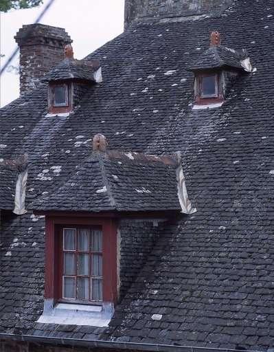 Edifice de plan massé, à trois travées en façade et dont l'entrée est décentrée. Le rez-de-chaussée, surélevé par un étage de soubassement qui comprend des caves, est précédé d'une large terrasse à balustrade sur laquelle s'ouvrent des portes-fenêtres. Gros-oeuvre en moellons de granite laissés apparents, les linteaux, entourages des baies et les chaînes d'angles sont en granite gris. Chaque lucarne couverte d'une croupe débordante supporte un épi de faîtage probablement issu des ateliers de la Poterie près de Lamballe (Côtes-d'Armor). La toiture est couverte d'ardoises épaisses de type Saint-Efflam (Côtes-d'Armor). Le poids du matériau de couverture a nécessité la mise en oeuvre d'une charpente massive visible la cage d'escalier.
