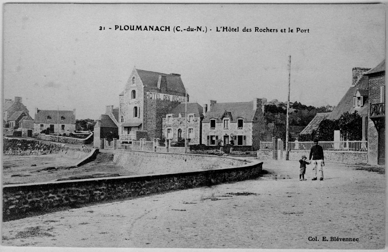 L'écart de Ploumanac'h, situé au nord-ouest du bourg de Perros-Guirec, est à la fin du 19ème siècle un petit hameau de pêcheurs construit autour d'un port naturel, de la chapelle Saint-Guirec et de l'oratoire du même nom. Les petites maisons couvertes de chaume ou de tuiles, sont construites dos au vent dominant qui vient de la mer. Au creux de rochers aménagés, vivent les plus pauvres. Les rochers de granite rose qui bordent le rivage et émaillent le territoire, sont les curiosités qui attirent le touriste dès 1880, avant même l'attrait pour les bains de mer. Ce site stratégique, possédait un château défensif démantelé vers 1594, et conserve encore de nos jours des guérites et poudrières. Un abri de canot de sauvetage est construit en 1912 à Pors-Kamor, informé des incidents par le sémaphore du Cribo construit en surplomb. Un phare est construit en 1860 sur une pointe de Ploumanac'h. Les deux édifices, détruits lors d'un bombardement allemand en 1944 sont reconstruits en 1948-1949. A la fin du 19ème siècle et durant la première décennie du 20ème siècle, les villas sont construites à proximité du phare (villa Park ar Men Ru, pour André Fortier-Maire, vers 1896), autour de l'anse Saint-Guirec (villa Ker Awel, pour un des fils de Gustave Eiffel vers 1903), autour du port (villa La Bagatelle pour Louis Christophe vers 1895), et à l'entrée de la vallée des Traouiéros. A la même période, les hôtels se multiplient, autour du port (Hôtel Bellevue, Hôtel des Rochers), puis autour de l'anse Saint-Guirec (Hôtel Beausite, 1930). Une partie du littoral autour de la plage de la Bastille est privatisée par le polononais Bruno Abakanowiecz (actuel parc de la Bastille acquis par la municipalité en 1950). Le site est un atout touristique pour Perros-Guirec, mais les rochers sont progressivement acquis par des propriétaires. Des mesures de protection s'imposent. Par une initiative privée d'abord : en 1901, un syndicat est créé à Paris afin de protéger les rochers et le paysage. Puis, certains sites bénéficient de protections : le 11 juillet 1912, une portion de terrain proche de Pors Rolland est classé, l'anse Saint-Guirec et le massif de Crech-ar-Cham sont inscrits le 8 avril 1937, le 09 octobre 1940, la lande de Ranolien est inscrite. En 1925, la création d'un parc municipal à Ploumanac'h est déclarée d' utilité publique, la totalité des expropriations est achevée en 1931 autour du rocher Le Squewel. Il est finalement inscrit le 6 avril 1945. En 1940, une zone non-aedificanti est décidée dans un périmètre de 200 mètres autour du phare. Le centre de l'écart, source de pittoresque pour Perros-Guirec, est peu modifié, le Plan d'aménagement d'extension et d'embellissement (PAEE) de 1933 précise d'ailleurs que le village ne doit pas être transformé. Afin de faire face à l'afflux de touristes, la chapelle est agrandie en 1938 par l'architecte James Bouillé. Les abords du port font l'objet d'aménagements au début du 20ème siècle : la plupart des maisons construites en limite des eaux sont protégées par un mur de soutènement. Le chemin d'accès à la cale de Pen-ar-Crec'h, réalisé en 1892, est élargi et surélevé pendant la Première Guerre mondiale (actuel chemin de la Pointe), ainsi que l'actuel quai Bellevue. La partie du quai entre la rue du Centre et la rue du Port est construite après 1962. En 1954, un camping aménagé est cité au croisement La Clarté-Ploumanac'h, vers 1960, il est déplacé vers le site classé de Ranolien.