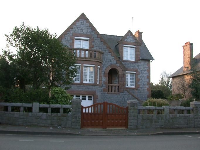 Maison de style régionaliste dont l'élévation antérieure sur rue est animée par une avancée latérale à pignon et par l'emploi d'un granite à deux teintes. L'avancée, agrémentée d'un bow-window à balcon montant de fond, présente un pignon découvert à rampants à crossettes de forme asymétrique résultant de la présence, à droite, d'un porche dans-oeuvre signalé par une baie en plein-cintre. La travée de droite est soulignée par une lucarne-pignon à crossettes. Le gros-oeuvre est édifié en moellons de granite gris soigneusement équarris. L'encadrement des baies, les garde-corps, les rampants à crossettes et les chaînes d'angles sont en granite rose.