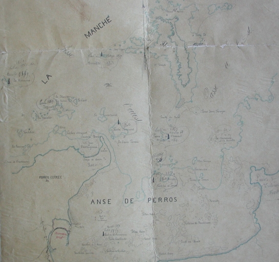 Les premières instructions nautiques de 1842 et le Pilote français, publié en 6 volumes en 1844, illustrent les vues des côtes et en particulier la rade de Perros-Guirec et la côte trégorroise, que Beautemps-Beaupré (1766-1854) a relevé en 1837-38, avec l'aide des ingénieurs hydrographes Givry et Bégat (entre Tréguier et Morlaix). Ces planches de "vues de côte" nous renseignent particulièrement sur les rochers en mer, les amers remarquables de la côte, telles que la Chapelle de la Clarté, les nombreux corps de garde, moulins à vent et colombier du littoral (moulins à vent de Kerprigent, de la Comtesse et le Colombier de la Rade). La rade de Perros-Guirec avec les feux de ses quatre maisons-phares, établis en 1860, représentait un abri d'accès aisé et un refuge pour les navires de la Manche, en dépit du peu d'aménagement du port de Perros-Guirec. Ce sont ces premiers travaux hydrographiques modernes qui permettent de mieux comprendre le choix d'implantation des ports et l'intérêt de réaliser des aménagements portuaires adaptés aux types de navires qui les fréquentent, entre le cabotage et la pêche professionnelle hier et la plaisance aujourd'hui. A remarquer que le port est concédé à la commune par concession.