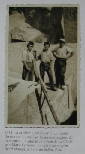Le massif de granite le plus connu et le plus remarquable est celui de Ploumanac´h. La qualité des pierres et leur beauté sont exceptionnelles ; leur réputation s´est étendue en France et dans le monde depuis près de deux siècles. L´extraction depuis 150 ans y a été intense, elle s´est déplacée, passant de la zone littorale de l´Ile Grande et autres îles au 19ème siècle, à la zone interne de la Clarté au 20ème siècle, en raison des différences de structure du massif. C´est seulement après 1900 que le granite de la Clarté a commencé à être exploité dans de grandes carrières. Sa couleur rose plaît. Mais une autre raison justifie le développement de sa production : il a la capacité de fournir en permanence les blocs de grande dimension qu´exige l´industrie granitière. La 1ère concession de La Clarté fut accordée à l'entrepreneur de carrières Leclerq en 1902 et résiliée en 1906. Cette première initiative eut pour effet de faire prendre conscience de la très belle qualité du granite, de sa couleur rose originale et de la richesse du sous-sol ; dès lors, il n'était plus possible de taire cette découverte et beaucoup voulurent saisir l'occasion pour réglementer l´exploitation. Au début du siècle, une carrière sur le Tertre employait déjà une trentaine d´ouvriers. Des traces d´exploitation sont encore visibles à l´ouest de la table d´orientation et au n° 1 de la rue des Bruyères. Les premières carrières ouvertes un peu avant 1914-1918 le furent par Perrot, Tilly Père, Gourdon et Hantz (propriétaire d'une partie de la vallée des Traouiëro) en 1926, d'où sortirent les premiers blocs taillés pour le bâtiment. Vers les années 1920-21, apparut le polissage pratiqué par des femmes. Pendant la 1ère moitié du 20ème siècle, de nouvelles carrières furent ouvertes par les entreprises des carriers Roche, Etienne, Hignard, Quéré, Gad, Hignard. En 1938, Migliarini relançait un chantier sur le chemin de Ranguillégan puis, dans les années 1970, la retraite venue, il céda cette carrière à la Société Hignard qui l´exploite toujours. Pendant la 2ème guerre mondiale, les bâtiments de la carrière Hignard servirent d'abri pour les soldats allemands, qui exploitèrent la carrière, puis Jean Prévost fils y séjourna par la suite. Ce fut ensuite l'entreprise Rébillon en 1976. Nous avons repéré les 3 derniers sites d'exploitation encore ouverts aujourd'hui : Rébillon (route de Ranguillegan), BGP Gad, et Hignard.