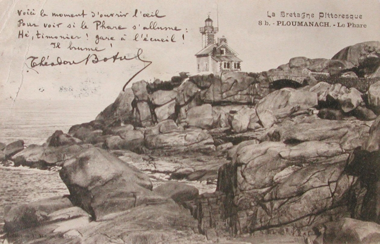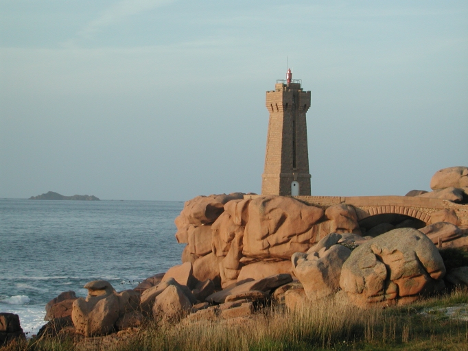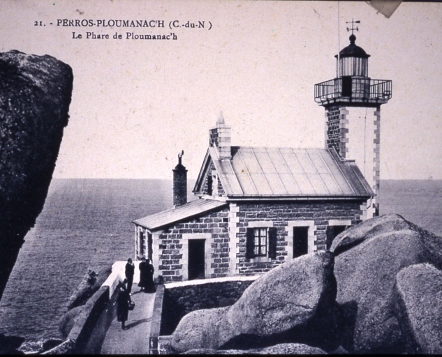 Le 22 janvier 1856, l'ingénieur des Ponts-et-Chaussées rapportait qu'une pétition avait été adressée au préfet des Côtes-du-Nord par de nombreux habitants des communes de Perros-Guirec et de Trégastel pour l'établissement d'un petit feu à l'entrée de Ploumanac'h, comme suite au naufrage d'un bateau pilote l'année précédente. L'ingénieur poursuivait son rapport en insistant sur l'importance du port de Ploumanac'h pour la pêche aux maquereaux et aux langoustes, qui alimente l'arrondissement de Guingamp, les ports de la Manche et jusque la ville de Paris (25 bateaux). Il mentionnait aussi le transport du goémon et du sable de mer, avant de revenir sur la navigation dangereuse de nuit et la présence régulière de la houle dans le chenal qui mène à l'anse de Ploumanac'h, exempte de tout ouvrage portuaire. Le premier projet devait être érigé sur "Castel Braz", au-dessus de la plage de la Bastille, mais la commission nautique décida à l'unanimité le rocher de Mean Ruz en Ploumanac'h. Le projet fut approuvé par décision ministérielle du 22 septembre 1858. L'adjudication du site fut obtenue en 1859 par Kerguenou, entrepreneur à Lannion. Le rocher fut dérasé et la tour construite sur la partie est de la roche. L'Etat du acheter une parcelle de 20 ares nécessaire pour cette construction et le droit de passage attenant au lieu dit "Lan lors Luron", où pu être construit un pont en granite avec une superbe voûte. Le 1er août 1860, la tourelle carrée en maçonnerie, de 2, 40 m de côté et de 8, 90 m de hauteur, contenant un escalier d'accès à la plate-forme de la lanterne, escalier à vis avec un diamètre de 12 40 m, était équipée d'un feu fixe rouge à pétrole avec une mèche unique, visible à 8 milles (15 km). Elle formait avec la tour de l'Île aux Moines et le clocher de la Clarté (amer remarquable), un angle de 170° et avec cette même tour et le clocher de Trébeurden, un angle de 136°. Le plan focal était de 24, 50 mètres au-dessus du niveau des plus hautes mers. Les premiers gardiens pouvaient arriver. L'ancienne tour était construite en pierre de taille (de la Clarté) pour les socles, corniches, angles, encadrement des portes et fenêtres, marches d'escalier et soubassement de la lanterne. La balustrade de la plateforme était de fer galvanisé et la toiture en zinc. Un petit hangar adossé au rocher recevait la provision de bois. Derrière la tour avait été accolée une petite construction servant de lieu d'aisance. La tour était adossée à un corps de logis long de 7, 30 m et large de 6, 40 m, contenant une chambre, une pièce servant de salle commune, un magasin aux huiles, un vestibule donnant accès à la tour, un bureau. A ce bâtiment avait été accolé, en 1886 un appentis séparé en deux pièces de mêmes dimensions servant de cuisine et de cellier accessibles par la salle commune. Sous le phare, côté est, un escalier en pierres de granite, taillées, menait à une cave, qui servait au gardien à stocker son cidre. Pierre Menguy fut l'un des derniers gardiens du phare de Mean Ruz jusqu'en 1945, où il était en poste avec sa femme Radegonde, née Colin (gardienne en titre, précédemment affectée au phare de Bréhat depuis 1902). Le bâtiment du gardien et de sa famille représentait un plan rectangulaire, avec une pièce unique au rez-de-chaussée (chambre) et un étage sous combles aménagé avec une seconde chambre (lis clos). En 1879, la parcelle de 2 ha 50 était achetée et annexée au phare, afin que les gardiens puissent disposer d'une fontaine et de l'alimentation en eau douce. Un bâtiment à usage de magasin à huiles (pétrole) pu ainsi y être construit. En 1886, le logement du gardien, annexé à la tour, était agrandi d'un nouvel appentis, desservi par une rampe légèrement inclinée. En 1921, le feu fixe était à secteur blanc et rouge. En 1930, la tourelle était blanchie du côté du large. Le 4 août 1944, le feu était détruit par les troupes allemandes dans leur débâcle. En attendant la reconstruction d'un nouveau phare, on éleva une tourelle métallique. En octobre 1948, un nouveau feu était allumé : feu à occultation toutes les 4 secondes, secteur blanc et rouge, sur le nouveau phare, une tour pyramidale réalisée par l'entreprise Martin et Frères de Lannion, selon les plans des architectes Auffret et Hardion, avec la participation de l'artiste Odorico pour les mosaïques intérieures. Ce fut l'entreprise de mosaïques, faïences, granite et carrelages Odorico et Baudoux de Rennes, qui fut chargée de l'exécution du revêtement du fanal de Ploumanac'h, concernant l'habillage des marches, des contremarches et du dallage d'entrée réalisé en granit de couleur blanche et jaune. La construction de ce nouvel édifice au même emplacement que l'ancien devait prendre en compte le "site particulièrement pittoresque, de caractère sauvage, et spécifiquement breton, un des plus visités de la côte bretonne constitué par un grand nombre de rochers de formes bizarres, arrondies en granit rose et roux, émergeant du sol". Le site environnant l'ancien fanal avait été classé et protégé peu avant la guerre, aussi l'architecte Auffret de Saint-Malo du travailler de concert avec les Beaux Arts. Le nouvel édifice présente une architecture totalement différente de l'ancien. Il s'agit d'une simple tour supportant l'appareil d'éclairage sans corps de logis attenant : le feu étant électrifié par une ligne souterraine et non gardienné. On logea l'appareillage et les pièces de rechange dans un local situé à 50 mètres de la tour, au sud-sud-est. Ce petit bâtiment carré en maçonnerie de pierres apparentes était une ancienne dépendance du fanal détruit.