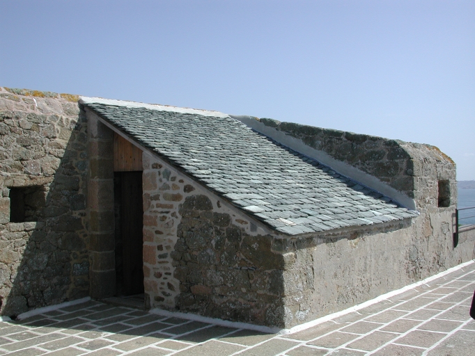 Les différents éléments et édifices constitutifs du patrimoine militaire de l'Île aux Moines sont datés entre le 2ème quart du 18ème siècle et le 2ème quart du 20ème siècle, si l'on y rajoute la cale réalisée par l'Organisation Todt, pendant la seconde guerre mondiale. Nous avons repéré l'ensemble des ces édifices et étudié particulièrement le fort, la batterie de Cosmoguer, la caserne et ses murs d'enceinte et de soutènement, ainsi que le corps de garde de l'Île Bono. Les Sept-Iles : Au large de Perros-Guirec, l'archipel des Sept-Iles occupe une place un peu à part sur le littoral trégorrois : il peut être en effet qualifié de véritable avant-poste défensif et possède essentiellement une vocation militaire que nous étudierons en détail. L'archipel ne connaît quasiment aucune autre occupation humaine, bien qu'il soit également un lieu de relâche fréquenté par divers bâtiments. Au Nord de l'isle de Tommée, une grande lieue, & à six lieues à l'Ouest quart de Nord-Ouest de Brehac, sont les Sept Isles, au travers desquelles on ne peut naviguer ; de l'isle la plus à l'Est s'étend un banc de rochers sous l'eau du côté du Sud sur l'extrémité duquel il y a un banc de rochers sous l'eau, qui est bonne marque pour éviter ledit banc, du côté de l'Ouest desdites isles s'étend encore quantité de roches dessus & dessous l'eau, ce qui fait qu'il ne faut pas les approcher de trop près. (sources : Bougeard : "Le Petit Flambeau de la mer", Faure, le Havre-de-Grâce, 1770). Sur le plan de l'ingénieur-architecte Garengeau daté de 1732 (AD 35), on peut situer les premiers projets de fortifications littorales : redoute, retranchements et batteries. Sur le plan de masse de cultures daté de 1805 et sur le plan daté de l'an XIII (1806), on peut remarquer sur l'Île Bono, la guérite au sud-ouest, le corps de garde et la batterie au nord, et sur l'Île aux Moines, les corps de garde, le donjon, la caserne et la poudrière. Si on considère le plan du site, réalisé par le Conservatoire du littoral, on peut situer les différents ouvrages de défense militaire, datés du second quart du 18ème siècle (1740-45) : le fort à pont-levis (avec redoute, réduit, logement de la garnison, corps de garde), la caserne (logement pour la garnison), récemment restaurée, avec le puits et le four à pain, encore en état, les murets de fortification autour du chemin de ronde (en partie détruits ou restaurés), les 5 batteries de côte dont la batterie du Veau (la plus importante de l'île, qui interdisait aux corsaires de mouiller entre l'Île Plate), l'ancienne poudrière et la batterie de Cosmoguer, qui protégeait des attaques à pied venant de Bono, à l'est, les nombreux corps de garde, dont celle accolée à la batterie de Cosmoguer, les chemin de ronde (au centre et au nord), la cale actuelle datée de 1949-50 et l'ancienne zone de débarquement. On peut aussi remarquer la tombe de Louis Ollivier Biez, où est gravé le texte suivant : "Ci-git Louis Ollivier Biez, âgé de 65 ans, époux de Catherine Gardaire, maître hydrographe et garde d'artillerie au fort - décédé le 17 mars 1799 – requiescat in pace amen". A remarquer que l'île aux Moines était la seule île à posséder un point d'eau potable, une source avec une ancienne fontaine au sud et un puits pour la caserne, qui ont facilité son occupation par une garnison importante.