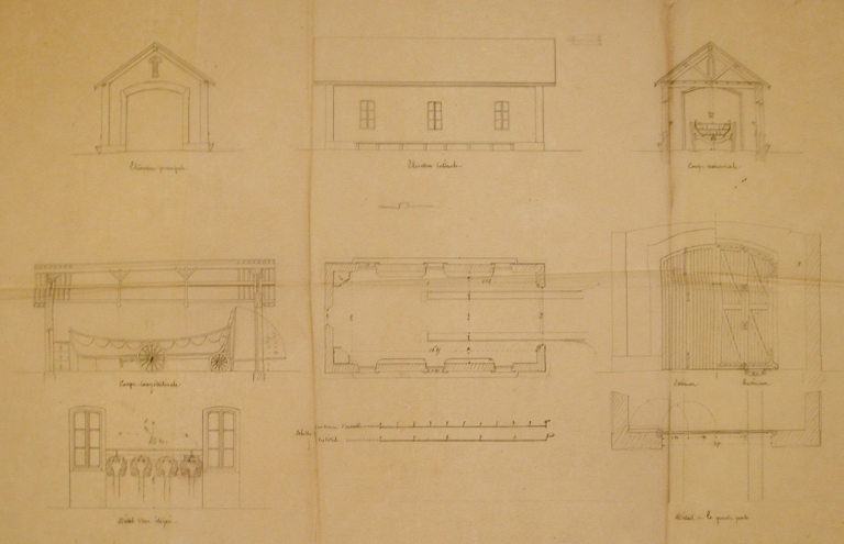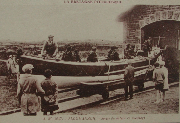 Le premier abri de sauvetage de Ploumanac'h a pu être construit en 1912 par la Société centrale de sauvetage des naufragés, dans l'anse de Portz-ar-Mor sur les plans proposés par l'ingénieur Pelaud pour l'abri du Kraou en 1866. Cette anse est abritée des vents d'ouest, mais ouverte au nordet. La maison-abri fut bâtie sur un terrain de 495 m2. Le bâtiment mesurait extérieurement 16 mètres de longueur sur 6, 60 mètres de largeur. Il offrait une porte cochère au nord et une petite porte au sud, des ouvertures en fenêtres sur les façades latérales. On peut cependant remarquer sur les photographies anciennes de l'abri de Ploumanac'h les ouvertures, avec un entourage en pierres taillées bouchardées et la construction des murs en moellons de granite avec des joints peints. Le plan est rectangulaire avec une travée unique sans étage. Les rails qui reçoivent le berceau du canot de sauvetage prennent leur point de départ dans l'abri, à partir d'un treuil. La cale de lancement fut réalisée dans l'axe du bâtiment, en prolongement de cette voie ferrée. Elle fut construite en moellons de granite et mesurait 90 mètres de long pour 4 mètres de large. Elle présentait une pente avec une déclivité de 0, 11 m par mètre. Un corps-mort et une chaîne de halage permettait au canot de s'écarter du rivage, dés qu'il était lancé.