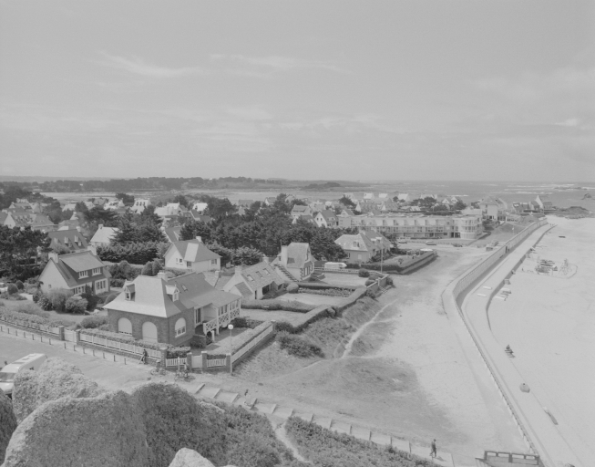 La station balnéaire de Trégastel se développe à la fin du 19e siècle autour de la chapelle Sainte-Anne des Rochers et comprend quatre plages principales : La Grève-Rose, la Grève-Blanche, Coz-Pors, et Tourony. A partir des années 1870, la bourgeoisie lannionnaise y vient pour son repos dominical, puis les premiers touristes attirés par les rochers roses viennent plus nombreux avec l' arrivée du train à Lannion en 1881. En 1884 est édifié le couvent-hôtel nommé le Castel Sainte-Anne, dirigé par des religieuses de la Congrégation des Dames des Sacrés-Coeurs de Jésus et de Marie, implantée Saint-Quay-Portrieux (Côtes-d'Armor) . Dès lors, les bains de mer se développent autour de la plage de Coz-Pors. Des Lannionnais et des Trégastellois construisent les premières villas afin de les louer, en bord de grève, et le long de la rue du Général-de-Gaulle. Puis, des Parisiens construisent des villas le long de la côte plate et dénudée, sur de vastes parcelles. En 1918, la portion de route en corniche entre Perros-Guirec et Sainte-Anne en Trégastel est achevée, et donne de l' impulsion au développement urbain, au détriment de Trégastel-Bourg. En 1912, la commune est érigée en station climatique et obtient d' être déclarée station touristique le 25 avril 1921. La perception de la taxe de séjour lui permet d' améliorer les réseaux d' eau, égout et électricité, et d' effectuer quelques travaux de modernisation au sein des plages (mur de soutènement au Coz-Pors en 1911-1914) . Un Syndicat d' Initiative indépendant de celui de Lannion est mis en place le 4 février 1930. Un Plan d' aménagement d' extension et d' embellissement (PAEE) est établi en 1932, approuvé par la Commission départementale en 1933, étendu à l' ensemble de la commune en 1936, mais seule la rue des Sept-Iles est réalisée sur huit voies prévues. La période de l' Entre-deux-guerres est marquée par l' élargissement du quartier balnéaire : l' ancienne plage du Coz-Pors étant devenue trop exiguë, les baigneurs se dirigent vers les autres plages, relayés par des investisseurs qui lotissent de vastes terrains, à la base de l' émergence de nouveaux quartiers (La Grève-Blanche en 1925, Tourony en 1927) . A partir de 1927, la route en corniche est prolongée vers Trébeurden. Entre 1939 et 1945, l' activité touristique est en suspens, les villas et hôtels de voyageurs sont occupés par l' armée allemande. Les constructions reprennnent lentement à partir de 1950. A la même période, la mairie est déplacée vers le quartier balnéaire et érige définitivement Trégastel-Plage comme nouveau centre actif de la commune.