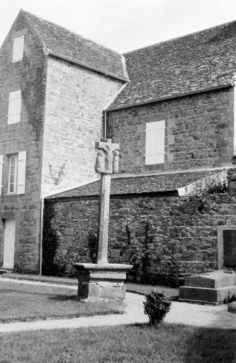 Calvaire en granite comprenant un soubassement à corniche débordante portant un fût monolithe de section octogonale sommé d'une croix monolithe ornée d'une Vierge à l'Enfant et de sainte Anne à l'est et d'un groupe de la Crucifixion à trois personnages à l'ouest (Christ, Vierge et saint Jean).