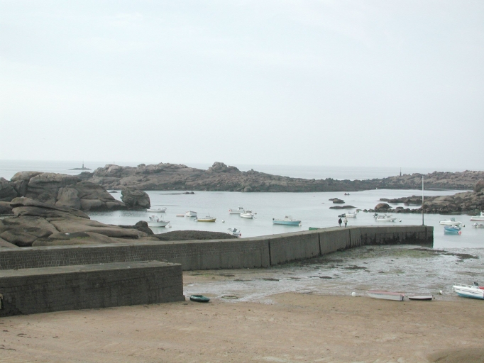 Le premier projet de deux cales débarcadères à Coz Pors a été dessiné en 1909 à la demande de la mairie de Trégastel : une 1ère cale longue de 16, 50 m et une 2ème cale de 105 mètres de long, en moellons bruts et en moellons smillés pour le parement. Cette 1ère cale fut réalisée vers 1912 sur des fonds communaux sans aide de l'Etat, pour une longueur de 9, 35 m, mais elle était seulement accessible en haute mer de vive eau. En 1917 : réparations de la cale débarcadère. En 1923-24, les projets sont revus à la baisse : établissement d'une cale de mi-marée de 50 m à l'est des rochers Enez Forn ; cependant les marins-pêcheurs réclamaient une cale de 120 m à cause de la faible pente du terrain. En 1931, nouveau projet de construction : la petite cale est rallongée pour atteindre 16, 50 m, afin d'accueillir des bateaux d'un tirant d'eau égal au moins à 1, 50 m. La longueur totale retenue de la grande cale est de 120 m avec une largeur de 2 m, exécutée en béton ordinaire, avec un noyau de maçonnerie en pierres sèches et une plateforme en béton. La réception des travaux eut lieu en 1932. Les deux cales ou quais ont conservé l'aspect de leur construction traditionnelle avec le parement en moellons de pierres sèches et seule la plateforme en béton.