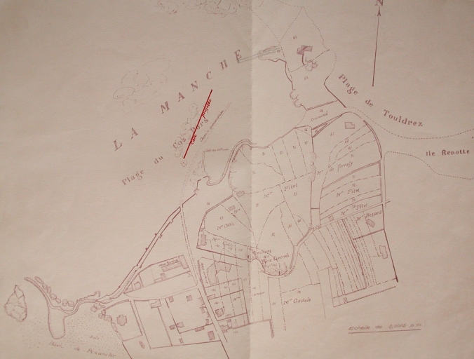 AD Côtes d'Armor. Série S ; sous-série S Supl. 219. Plan parcellaire de la baie de Coz Pors vers 1911 : le chemin des goémoniers est parallèle au projet de grande cale.