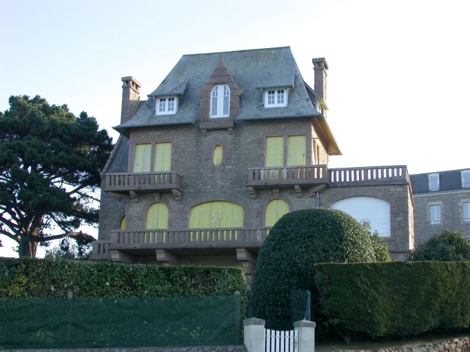 Edifice qui résulte de l'imbrication de deux corps de bâtiment de plan massé aux fonctions différentes : espaces de réception et privés pour le corps antérieur sur mer, et espaces de service et de distribution pour le corps postérieur. Gros-oeuvre en moellons de granite laissés apparents, les chaînes d'angles, entourages de baies et garde-corps sont en granite rose, les balcons en ciment. Sur la façade du corps de bâtiment sur mer, symétrie des baies autour de la travée centrale où se superposent une large baie en anse de panier, un occulus polygonal, et une lucarne surmontée d'un fronton-pignon triangulaire à crossettes, agrémentée d'une jardinière en ciment. Les travées latérales, identiques, sont composées d'une baie cintrée au rez-de-chaussée, de baies jumelées couvertes d'un linteau à l'étage carré et d'une lucarne rampante sur le toit. Les huisseries sont peintes en jaune, pour rappeler la couleur de la fleur d'ajonc, et celle des camions de déménagement, profession du propriétaire. Entrée située sur la façade postérieure, protégée par un porche hors-oeuvre.