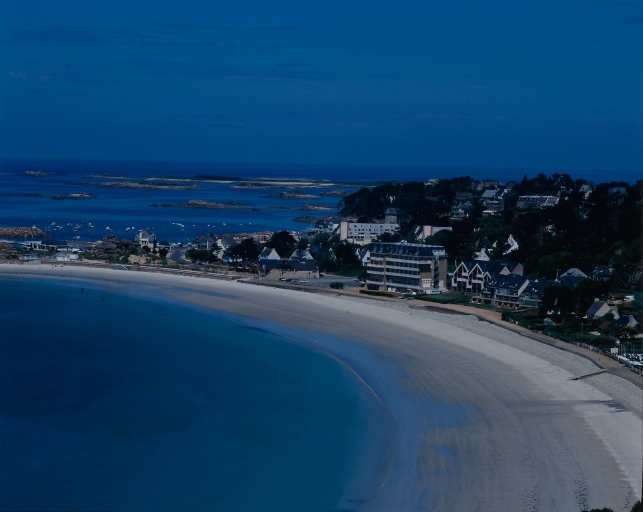 Le quartier balnéaire de Tresmeur se développe autour de la plage du même nom. Il est limité à l' est par des coteaux. Une ancienne ferme, dont certains corps de bâtiment sont encore visibles, occupe le site qui s' appelait Traou-Meur. Au début du 20e siècle des cabines de bain en bois sont implantées au nord-ouest de la plage, idéalement orientées au sud, sur un terre-plein menant au Castel. Les constructions sont rares à la fin du 19e siècle : une maison appartient à la famille de Boisboissel puis De La Villéon (aujourd' hui détruite) et vers 1901, une petite maison est construite pour un certain Morvan originaire de Quintin (Côtes-d' Armor) . Quelques cabanes colonisent le bord de grève. Léon Warenghem, distillateur à Lannion et président du Syndicat d' initiative de Lannion et ses plages, acquiert de nombreuses parcelles en front de mer, et tente de les revendre. Mais il faut attendre la deuxième moitié du 20e siècle pour que l' ensemble soit effectivement loti et construit. Ce sont les terres situées en surplomb de la plage, à Ty Plat, qui sont préférées pour l' implantation de villas : Ty Plad vers 1895, Ker Lanneck et Kerig an Avel vers 1912. La plage de Tresmeur n' est accessible par voie carrossable que tardivement, dans les années 1930 ce qui n' incite pas à la construction de villas. Le front de plage, surtout composé de dunes, est aménagé par la mise en place d' un trottoir au début des années 1920, prolongé en 1925. Au cours du 2e quart du 20e siècle, le quartier se développe : deux grands hôtels de voyageurs sont construits (Celtic Hôtel, 1929 et Printania, 1930) et quelques rares villas (Mer et Falaise, 1929) . Le 3 décembre 1935, les Roches Blanches, masse granitique située à l' entrée de la plage sont classées. Le nombre de constructions baisse de 1940 à 1960 environ. Avec le prolongement de la route en corniche vers Pors-Mabo, les pentes abruptes jusqu' alors inexploitées et désormais accessibles sont lentement construites. En 1967 sont aménagées des cabines en béton qui coexistent quelques années avec des cabines de bois. Dans les années 1970, le front de mer est réaménagé : la digue est prolongée depuis les Roches-Blanches jusqu' à l' extrémité sud de la plage, une nouvelle vague de constructions comble partiellement les nombreuses terres encore vierges, avec l' édification d' immeubles à logements. Les hôtels de voyageurs, sont transformés en immeubles à appartements (Celtic) et en colonie de vacances (Printania) . De nouveaux projets d' aménagement sont actuellement en cours, ayant entraîné la destruction d' une villa en front de mer courant 2000.