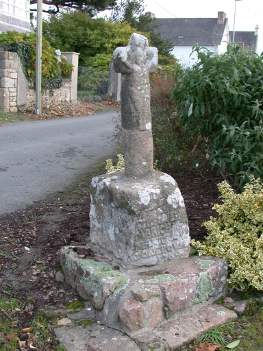 Croix taillée dans le granite. Elle est composée d'un soubassement formée par un emmarchement à deux degrés et d'un socle portant une croix à branches courtes ornée d'un décor sculpté en bas-relief (Christ en croix à l'avant et Vierge couronnée à l'Enfant à l'arrière). Le socle est orné à l'avant de trois instruments de la Passion et d'une inscription mentionnant les noms des commanditaires et la date de l'édicule). Il présente également sur le côté droit une dédicace à l'attention de Notre-Dame de Bonne Nouvelle. Le fût est brisé.