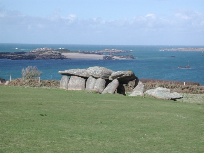 L'allée couverte, située sur un tertre, est partiellement effondrée et probablement amputée de nombreuses pierres, mais elle a conservé son aspect monumental et partie de sa couverture. Aujourd'hui, seuls 10 piliers debout soutiennent 3 dalles encore en place (elle était supportée par au moins 4 piliers qui sont à terre ou mutilés). Des traces d'autres piliers montrent qu'il y avait au moins une autre dalle. La longueur totale du monument était au maximum de 14 m et probalblement même 19 m. Il semblerait qu'il y aurait eu sur la façade nord une entrée latérale (70 cm de large) ; l'accès à l'allée couverte se faisant par un vestibule aujourd'hui disparu. L'axe de l'allée couverte est 116°-296°. La face externe des dalles et des piliers est brute, tandisque la face interne sembla avoir été travaillée, de lmanière à la rendre plane. La cellule antique intégrée au bâtiment de ferme de l'île mesure 3, 50 m sur 4, 50 m de profondeur et 2 m de hauteur. Sept grosses dalles de 0, 50 le large, forment la charpente interne de cette cellule ; les murs sont construits en moellons de granite à gros grains ; la couverture originelle a été recouverte de ciment avec un linteau en béton, visible à l'entrée, dépourvue de huisserie.