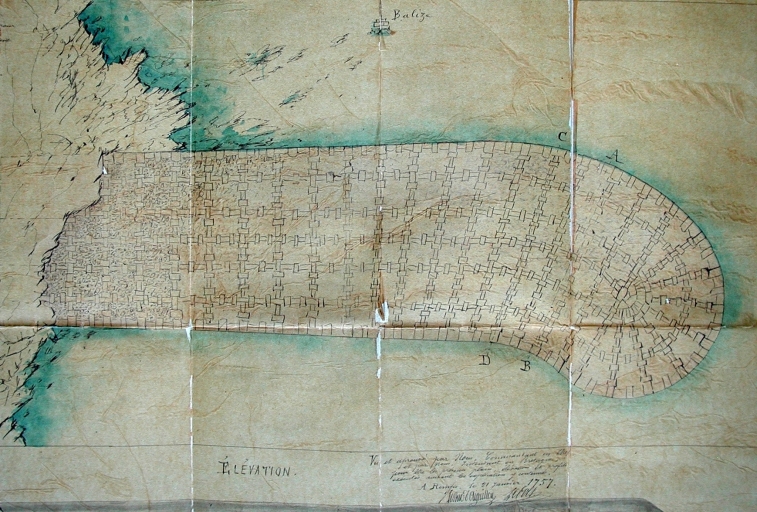Sur ce plan, on peut remarquer la présence d'une balise, située à 8 toises, afin de profiter de l'élévation des pointes de rocher, qui brisent l'effort de la mer. La jetée s'ancre à 2 pieds (66 cm) de profondeur dans le rocher, pour une largeur de 90 pieds (29,70 m) à la base, 26 pieds de hauteur (8,58 m), depuis le niveau de la grève, 20 pieds (6,60 m) de large au sommet, en couronnement sur 35 pieds (11,55 m) de talus de chaque côté. L'appareillage est prévu en pierre de taille avec des moellons à l'intérieur et des pierres rapportées au pied de la digue, sur un plan très incliné, afin de rompre l'effort de la mer dans la partie qui s'étend depuis la balise jusqu'à l'extrémité et le pourtour de la tête de cette jetée (sources AD 22, S, Suppl. 94).