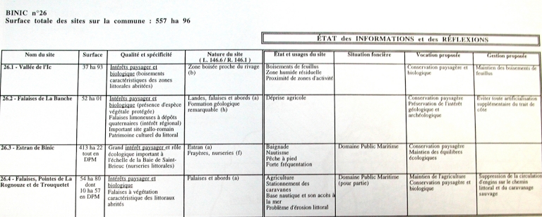 Les paysages littoraux remarquables de la commune de Binic ont été inventoriés en 1998 par la DIREN Bretagne et les Service des Espaces Naturels du Conseil Général des Côtes d'Armor. La surface totale des sites sur la commune est de 557 ha 96. Les sites littoraux remarquables sont les suivants : - la vallée de l'IC couvre 37 ha 93, de zone boisée proche du rivage (boisement de feuillus), avec une zone humide résiduelle, à proximité d'une zone d'activité. La gestion proposée est le maintien des boisements de feuillus - les falaises de la Banche couvrent 52 ha, d'intérêt paysager et biologique (présence d'espèces végétales protégées), de landes, falaise et abords (formation géologique remarquable, falaises limoneuses à dépôts quaternaires). Il faut cependant remarquer la déprise agricole du site et le problème d'érosion. Un important site gallo-romain, les Bernains, fouillés par Jean-Yves Eveillar, est à signaler. La vocation proposée est de préserver l'intérêt paysager, géologique et archéologique du site, en évitant toute artificialisation supplémentaire du trait de côte. - L'estran de Binic occupe 413 ha 22, tout en DPM, de grand intérêt paysager, jouant un rôle écologique important à l'échelle de la baie de Saint-Brieuc (nurseries littorales). La vocation proposée est le maintien des équilibres écologiques. - Les falaises, pointes de la Rognouze et de Trouquetet, couvrent 54 ha 80 dont 10 ha 57 en DPM. Ces falaises abritent une végétation caractéristique des littoraux abrités. Le maintien de l'agriculture et la conservation paysagère et biologique de ces espaces est proposée, en interdisant la circulation d'engins motorisés sur le chemin littoral et le caravanage sauvage. La Commune de Binic fait partie du Schéma de mise en valeur de la mer de la Baie de Saint-Brieuc, élaboré en 1995 par les services de l'Etat.