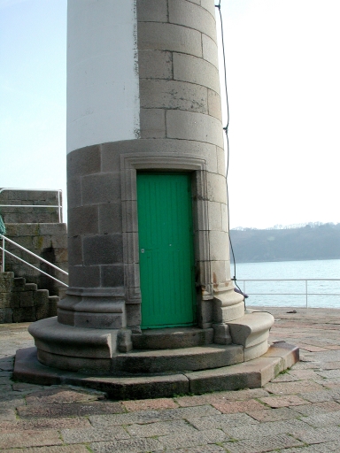 On pénètre à l'intérieur de la tourelle par une porte tournée du côté de la terre et pratiquée à 0,50 mètre au dessus du niveau de la plate forme de la jetée. On y accède au moyen de 2 marches. On arrive au palier supérieur sur lequel repose l'appareil par un escalier à noyau plein comprenant 45 marches. Ce sont les marches qui forment par leur prolongement le noyau plein de l'escalier. Celui-ci a le même axe que la tourelle et 0,20 mètre de diamètre jusqu'à la 42ème marche, et au-dessus, son diamètre est porté à 0,30 mètre. La première marche est établie à gauche et immédiatement à l'angle de la porte d'entrée. L'intérieur de la tourelle est mis en communication avec la plate-forme au moyen d'une porte ménagée dans le soubassement de la lanterne.