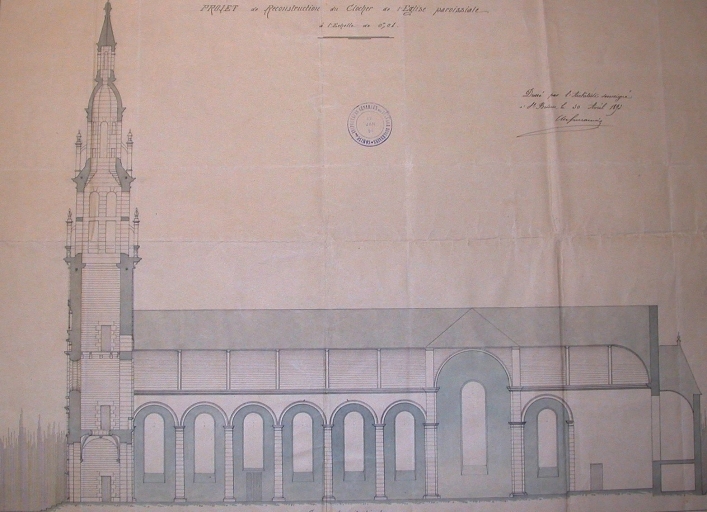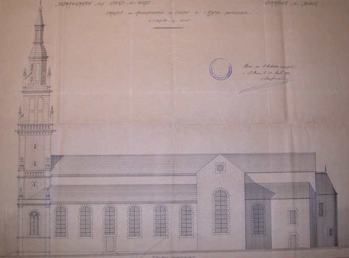 AD Côtes-d'Armor : V 859, église (restauration, reconstruction du clocher) : décret, devis, rapports, plan, délibérations, correspondance (1893-1903).