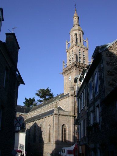 L'église Notre-Dame-de-Bon-Voyage date de la 2ème moitié du 19ème siècle et du début du 2ème quart du 20ème siècle. Elle a progressivement remplacé une première église construite de 1821 à 1823 par l'architecte Louis Lorin à l'emplacement de l'ancienne chapelle Saint-Julien (bénédiction de la première pierre le 22 octobre 1821, bénédiction et consécration de l'église les 21 décembre 1823 et 5 avril 1825). D'après René Couffon, cette première église, probablement trop exiguë, a été profondément remaniée à partir du 3ème quart du 19ème siècle. Le choeur et le transept ont été reconstruits de 1858 à 1860, puis la façade et le clocher ont été construits à partir du 15 avril 1895 par l'architecte diocésain Eugène Le Guerrannic. Toujours selon la même source, la nef a été édifiée en 1929 et 1930.