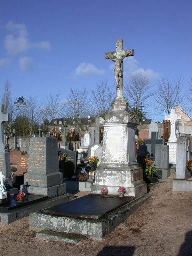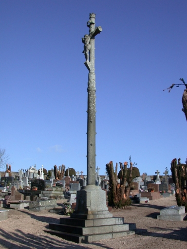 La croix de cimetière est une croix de type Hernot en granite dressée sur un socle à griffes posé sur un soubassement formé par un emmarchement à trois degrés. Le socle porte l'inscription O crux ave spes unica à l'avant, la date 1882 et la signature de l'auteur à l'arrière. Le fût est écôté et sommé d'une bague. Il porte une croix en mauvais état ornée d'un Christ en croix en ronde-bosse surmonté de l'inscription INRI (titulus). Les sépultures sont édifiées en granite, en marbre et en kersantite.
