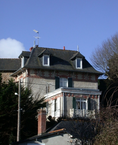 Maison de plan rectangulaire simple en profondeur construite en moellons de granite et schiste (gros-oeuvre) et en brique (élément de décor). Elle est précédée d'un corps de bâtiment en rez-de-chaussée surélevé accueillant l'entrée et présente un toit à croupes avec égouts retroussés maintenus par des aisseliers. Eléments de décor : brique, aisseliers, épis de faîtage en zinc, lucarnes à demi-croupe débordante.