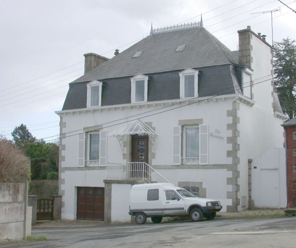 Maison de plan rectangulaire massé probablement double en profondeur construite en granite (le gros-oeuvre est recouvert d'un enduit peint en blanc). Elle est composée d'un étage de soubassement, d'un rez-de-chaussée surélevé et d'un étage de comble abrité sous un toit brisé à croupes percé de lucarnes et sommé de deux épis de faîtage et d'une crête en zinc. La porte d'entrée est desservie par un escalier en maçonnerie et est abritée sous une marquise. Eléments de décor : toit brisé à croupes, lucarnes, ferronnerie, marquise, épis de faîtage et crête en zinc.