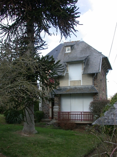 Maison de plan massé construite en moellons de granite et schiste et en brique. Elle est composée d'un rez-de-chaussée légèrement surélevé, d'un étage carré et d'un comble abrité sous une toiture à croupes débordante maintenue par des aisseliers décoratifs. La façade antérieure présente un large décrochement ouvert d'une grande baie au rez-de-chaussée et abrité par le prolongement du toit principal. Sa partie supérieure est édifiée en brique de couleur ocre. La porte d'entrée décalée à gauche est desservie par un degré et est abritée sous un auvent. L'entourage de plusieurs baies couvertes en plate-bande avec clé de granite présente une alternance de brique à deux teintes (rouge et ocre). Elle comprend un portail couvert d'un auvent maintenu par des aisseliers.