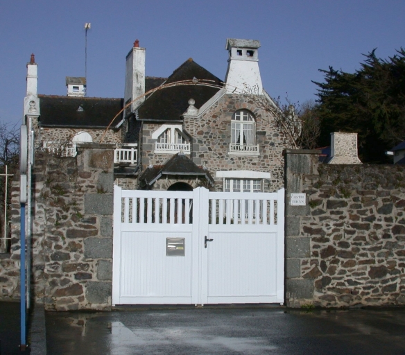 Maison d'architecte construite en moellons de granite et schiste. Composée d'un sous-sol, d'un rez-de-chaussée surélevé et d'un étage de comble, elle comprend un corps de bâtiment principal de plan massé couvert d'un toit à croupes présentant en façade un mur-pignon en léger ressaut sommé d'une souche de cheminée décorative. L'entrée, située à l'avant, est abritée par un porche hors-oeuvre ouvert d'une baie en plein-cintre couverte en plates-bande de schiste. Ce corps de bâtiment est flanqué à gauche d'un corps de bâtiment secondaire précédé d'un bâtiment en rez-de-chaussée couvert d'un toit-terrasse couronné de gardes-corps. Eléments de décor : pignons découverts, boules, lucarnes-pignon, baies en plein-cintre, linteaux à extrados en bâtière et gardes-corps peints en blanc, souches de cheminée.