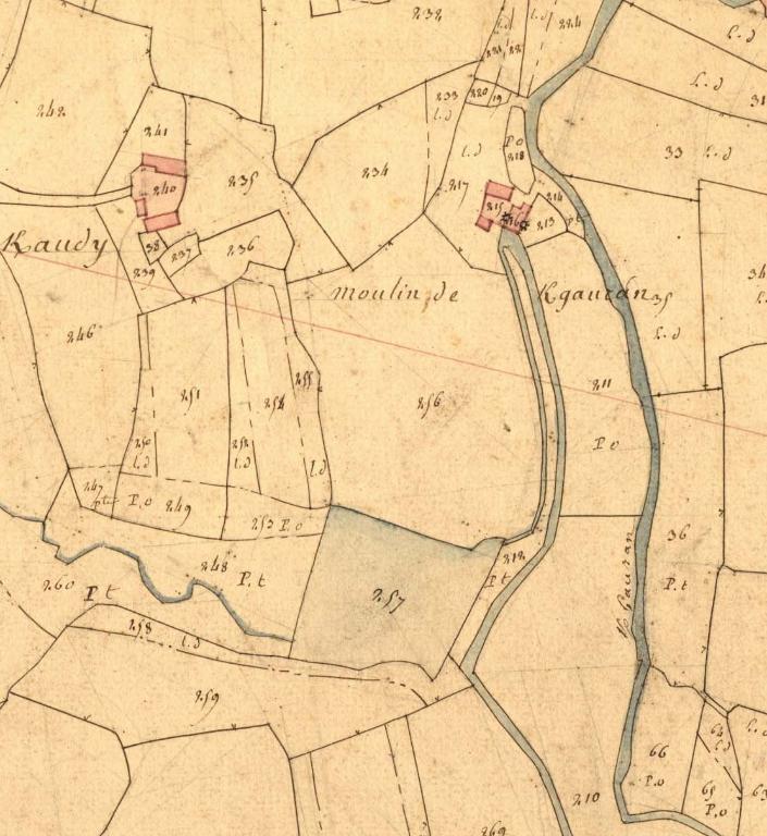 Deux autres bâtiments figuraient sur le plan cadastral de 1835 ; celui du sud, petit, a été remplacé par le logis du meunier à la fin du 19e siècle ou au début du 20e siècle. Le second en ruines est difficile à dater. (C. Toscer)