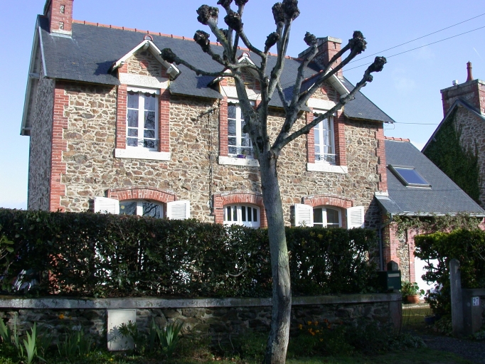 Maison construite en moellons de granite et schiste. Flanquée à droite d'une remise à automobile, elle est composée d'un rez-de-chaussée à deux pièces et d'un étage en surcroît éclairé par trois lucarnes-pignon. La façade antérieure est rythmée par trois travées de baies régulières. Eléments de décor : brique (encadrement des baies et chaînes d'angles), ferronnerie, lucarnes-pignon.