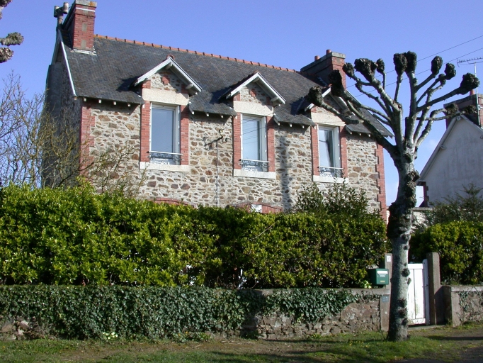 Maison construite en moellons de granite et schiste. Elle est composée d'un rez-de-chaussée à deux pièces et d'un étage en surcroît éclairé par trois lucarnes-pignon. La façade antérieure est rythmée par trois travées de baies régulières. Eléments de décor : brique (encadrement des baies et chaînes d'angles), ferronnerie, lucarnes-pignon.