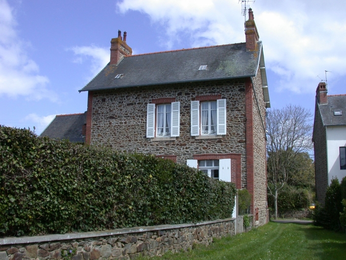 Maison de type ternaire à double orientation construite en moellons de granite et schiste. Flanquée d'une aile basse à droite, elle est composée d'un sous-sol, d'un rez-de-chaussée surélevé, d'un étage carré et d'un étage de comble. Ouverte d'une porte-fenêtre à balcon à l'étage, la travée axiale antérieure est en ressaut et est affirmée par un pignon à toiture débordante ornée d'aisseliers. Eléments de décor : brique (encadrement des baies, chaînes d'angles, frises), lucarnes-pignon à fermette débordante, balcon, pignon, ferronnerie.