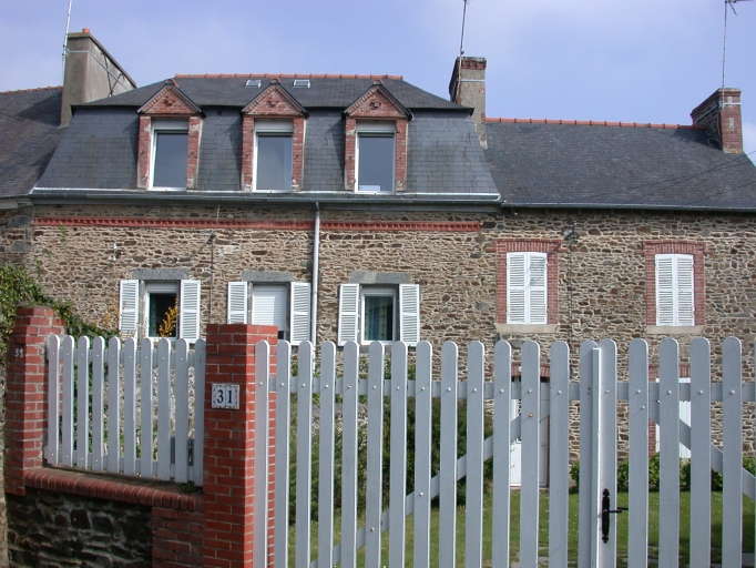 Maison mitoyenne de type ternaire construite en moellons de granite et schiste. Elle présente un bandeau de brique à l'avant et comprend un étage de comble abrité par un toit brisé à croupes percé de trois lucarnes-pignon édifiées en brique.