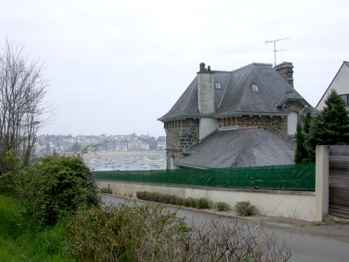 Maison construite sur un site de promontoire avec vue sur le port de Saint-Quay-Portrieux. Edifiée en moellons de granite et schiste laissés apparents, elle est composée de deux corps de bâtiment principaux disposés en équerre et d'un corps secondaire plus bas à l'arrière. L'élévation principale est édifiée en moellons de granite polygonaux. Elle présente une travée sur l'angle affirmée par un bow-window à balcon au rez-de-chaussée et par une porte-fenêtre surmontée d'un pignon interrompu par une demi-croupe débordante sommée d'un épi de faîtage en terre-cuite vernissée. Eléments de décor : bow-window à balcon, demi-croupes, balcons, brique, aisseliers, épis de faîtage, toiture débordante.