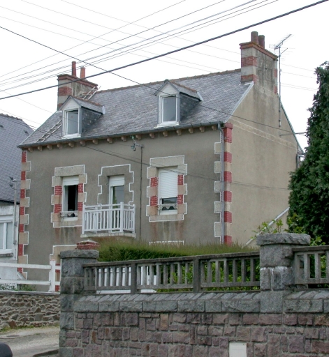 Maison de type ternaire dont le gros-oeuvre est recouvert d'un enduit de ciment et dont l'encadrement des baies et les chaînes d'angles présentent une alternance régulière de brique et de granite. Eléments de décor : brique, ferronnerie, lucarnes-pignon.