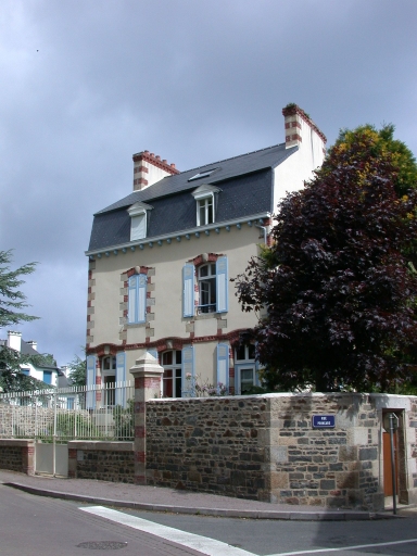 Maison couverte d'un toit à longs pans brisés. Elle est composée d'un sous-sol semi-enterré, d'un rez-de-chaussée surélevé, d'un étage carré et d'un étage de comble éclairé par des lucarnes à fronton-pignon triangulaire en charpente. L'élévation antérieure présente un ordonnancement sans travées (trois baies au rez-de-chaussée, dont la porte d'entrée située à droite, et deux baies à l'étage). Une tour circulaire demi-hors-oeuvre enfermant l'escalier de distribution intérieur est située au centre de l'élévation postérieure. Le gros-oeuvre est recouvert d'un enduit. L'encadrement des baies couvertes en plate-bande avec clé de granite et les chaînes d'angles présentent une alternance régulière de brique et de granite. Eléments de décor : ferronnerie, brique, lucarnes.