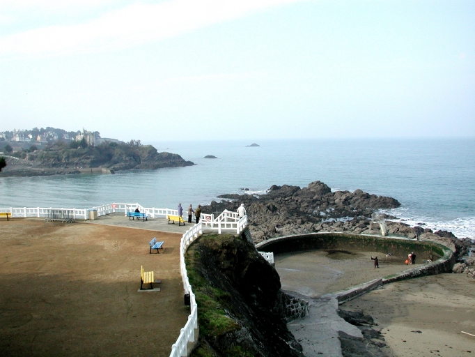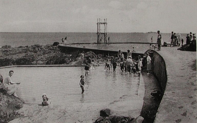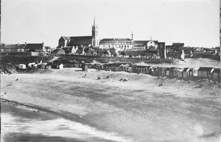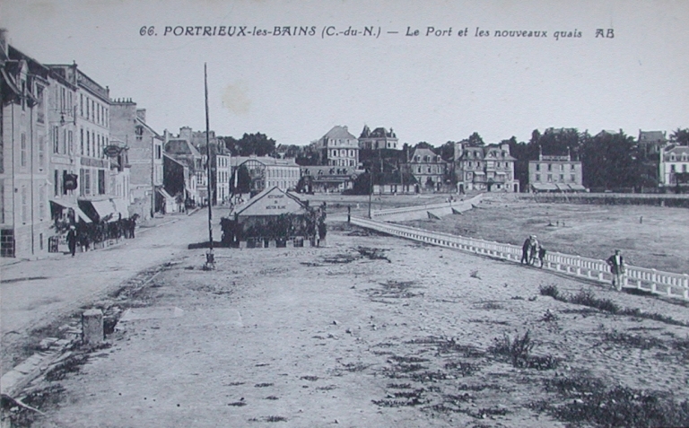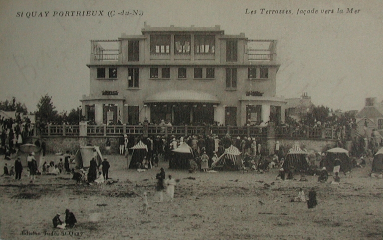 Les différents plans du front de port en 1861 et 1880 montrent l'effondrement des clôtures à l'est de la grève de St-Quay à cause du prolongement de la jetée et de la violence des vagues (travaux effectués entre 1870 et 1880). En effet, depuis 1825, la falaise argileuse a reculé de 40 m (1 ha) entre la pointe de Port Es Leu et les rochers du Tertre Denis, soit 1 m par an de 1795 à 1852. La falaise d'argile de Port Es Leu (qui s'écrivait Porteleu) au 19ème siècle a reculé de 15 m. Les murs de clôture construits en 1872, au commencement des travaux du port, ont été réalisés sur du sable mou. En conséquence, le port s'est creusé depuis 1876. (AD 22, S, Suppl. 202). De 1831 à 1872, la commune a entrepris de vendre des terrains sur les dunes de Saint-Quay. Cette situation a entraîné un conflit avec l'Etat qui revendiquait la propriété de ces parcelles, comme faisant partie du Domaine Public Maritime. En 1876, un procès-verbal a délimité le territoire de l'Etat et le territoire communal de façon définitive. En 1878, on pouvait remarquer sur le front de port, à côté des premières cabines de bains, l'atelier du cordier le Touzé (présent depuis 1859) et celui du charpentier de marine Augustin Rebours (concession de 200 m2). Après la 1ère Guerre Mondiale, Saint-Quay Portrieux connut une autre période faste sous l'impulsion de Monsieur Delpierre, Maire de l'époque, avec la construction de nombreux équipements touristiques et balnéaires en front de port : aménagements des quais, des cales, d'une promenade avec balustrade, des sentiers littoraux, de la piscine d'eau de mer, du cinéma théâtre, du Casino... Ce dernier fut sans doute l'un des premiers établissements de thalassothérapie en 1929. Il comportait au rez-de-chaussée le Casino avec orchestre et bar, un jeu de boules et un salon de coiffure. A l'étage, les bains étaient aménagés en plusieurs alcôves avec baignoires d'eau de mer chauffée, douches et tables de massage. Le Casino était alors couvert de terrasses, toute la façade côté mer était en plein air, protégée du vent par des vitrages. La commune de Saint-Quay-Portrieux obtenait un 1921 l'agrément ministériel de classement comme station touristique. Dès 1922, le maire Alfred Delpierre (1875-1957) fit élever des murets pour aménager "les Terrasses de Saint-Quay", sur lesquelles il fit déplacer les cabines de bains en bois. Ainsi, depuis le grève Noire et jusqu'à la plage du Châtelet, les cabines étaient alignées sur plusieurs rangées. Seules trois de ces cabines sont encore visibles entre la plage du Casino et la grève Noire. Delpierre fit encore aménager une promenade avec une petite digue le long de la plage du port et un jardin public, planté de palmiers. A côté du cinéma-dancing, il y avait un jardin municipal, en forme de gradins, avec de longues marches circulaires formant une petit amphithéâtre, où les spectateurs venaient assister à des concerts. Le maire décida la construction des fameuses barrières blanches le long du sentier de la corniche, de la Promenade et des terrasses, qui représentent aujourd'hui le symbole de la station. Il réalisa encore un stade nautique, situé au pied de la pointe rocheuse du Châtelet, arasé pour l'occasion. Un important radeau "water-chute" à étages, avec un toboggan en cuir complétait ce nouveau équipement nautique. La sécurité des baigneurs étaient assurée par une équipe de "garde-plage", postés dans des postes de guet. D'autre part, la station touristique bénéficiait d'une animation à la fois sportive et festive de grande qualité. Ces aménagements sont encore visibles aujourd'hui et participent de la renommée et du charme de la station touristique littorale de Saint-Quay-Potrieux.
