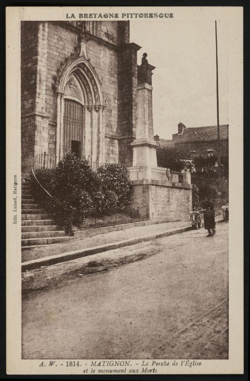 Monument aux morts de la guerre 1914-1918 érigé à la demande du conseil municipal de Matignon par Eugène Cocheril, entrepeneur à Languédias (Bretagne, 22). Les principales étapes de sa construction sont les suivantes : - 12 juin 1921 : délibération du conseil municipal de Matignon en faveur de l'érection d'un monument aux morts. - 26 février 1922 : approbation par le conseil municipal de Matignon des plans et devis de l'entrepreneur Eugène Cocheril. - 30 novembre 1922 : réunion de la commission départementale pour l'érection des monuments aux morts : ajournement du projet d'Eugène Cocheril, la commission préférant au poilu en fonte bronzée un poilu en granite. - 27 février 1923 : proposition d'un second projet de monument aux morts par l'entrepreneur Eugène Cocheril. - 20 novembre 1923 : réception définitive du monument aux morts pour la Patrie de la commune de Matignon.