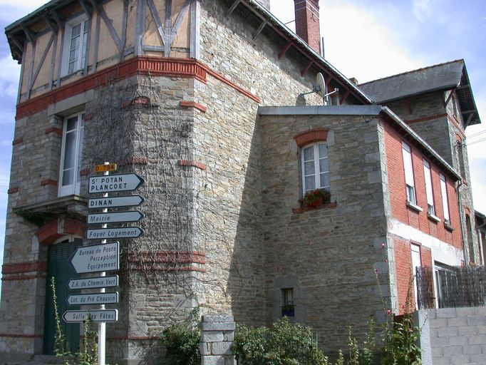 Edifice construit sur une parcelle d'angle en moellons de schiste (pierre de Saint-Cast). La façade antérieure, rythmée par cinq travées de baies régulières, et l'élévation latérale ouest à pans coupés, présentent un pan de bois en partie haute. Il est composé d'un sous-sol, d'un rez-de-chaussée surélevé, de deux étages carrés et d'un comble. La façade postérieure présente un corps de bâtiment en appentis en partie édifié en brique, ainsi qu'une travée latérale en ressaut affirmée par un pignon. Eléments de décor : brique (couvrement des baies, bandeaux), aisseliers, pan de bois, balcon.