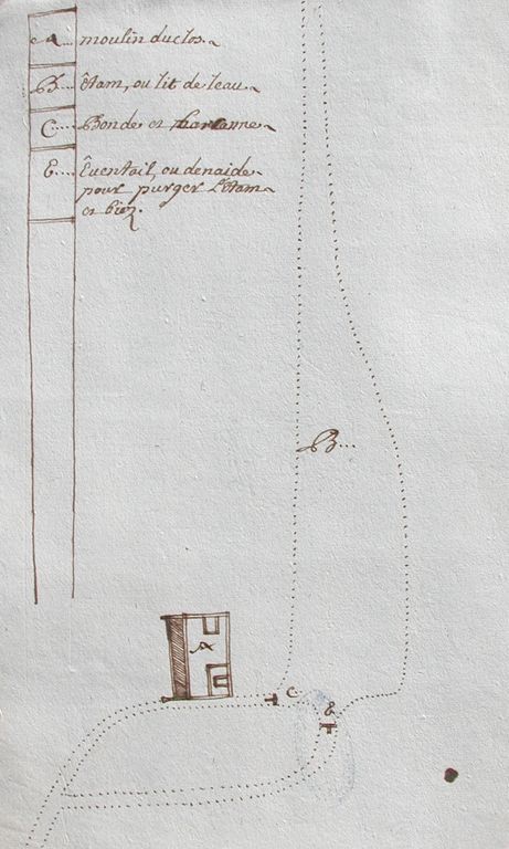 AD Côtes d'Armor. Série J J . Art. 197. Plan du moulin du Clos ; plan d'un fournil, 2ème quart 18ème siècle.