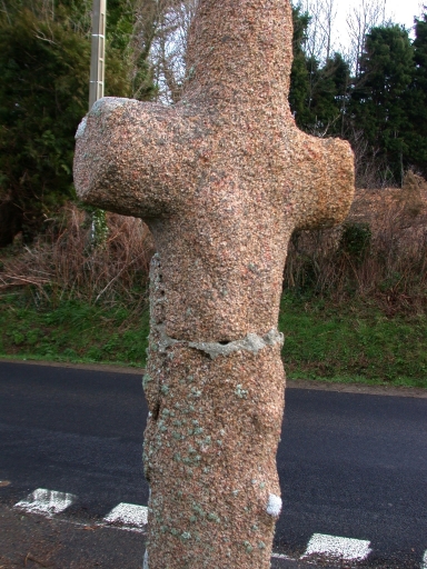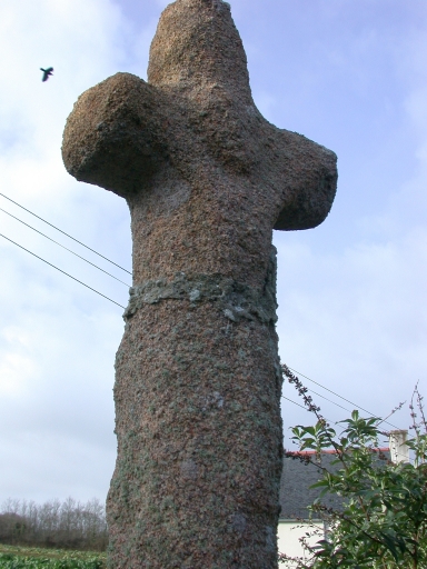 Ancienne croix monolithe à branches courtes, composée actuellement de trois morceaux, dressée sur un socle posé sur un emmarchement à trois degrés. Elle présente un Christ en croix et une Vierge à l'Enfant scultpés en bas-relief.