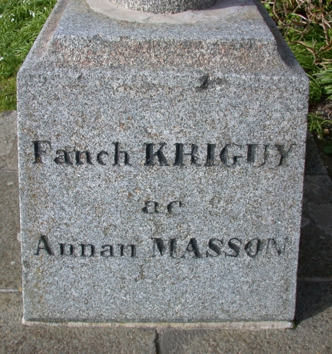 Croix de chemin de l'atelier Yves Hernot de Lannion (analyse stylistique) érigée au mois de mai 1869 à l'initiative de Fañch Keriguy et d'Anne Masson (d'après inscription). La croix terminale a été rapportée probablement vers 1950.