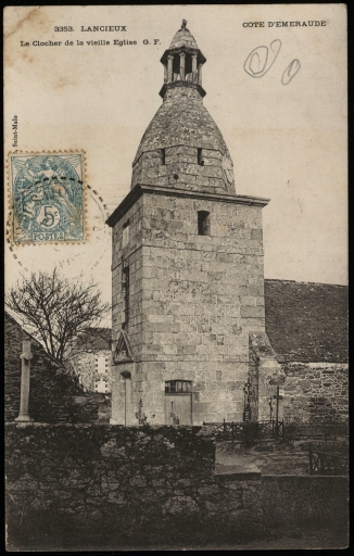 L'ancienne église paroissiale de Lancieux accusait un tel état de délabrement à la fin du 19ème siècle qu'elle suscita de vives inquiétude de la part du maire de l'époque, Pierre Lhotelier. En novembre 1899, l'architecte diocésain Eugène Le Guerrannic recommanda d'abandonner la vieille église pour la reconstruction d'un nouveau sanctuaire. La nouvelle église ayant été livrée au culte en 1902, l'ancienne église fut démolie en partie le 10 mai 1905. La tour, unique vestige de l'édifice dont les parties les plus anciennes étaient probablement datées du 15ème siècle, présente le millésime 1740 (la première de cette tour fut posée d'après J.-P. Bihr le 26 juin 1739). Elle a fait l'objet d'une inscription à l'Inventaire supplémentaire des monuments historiques le 21 décembre 1925.
