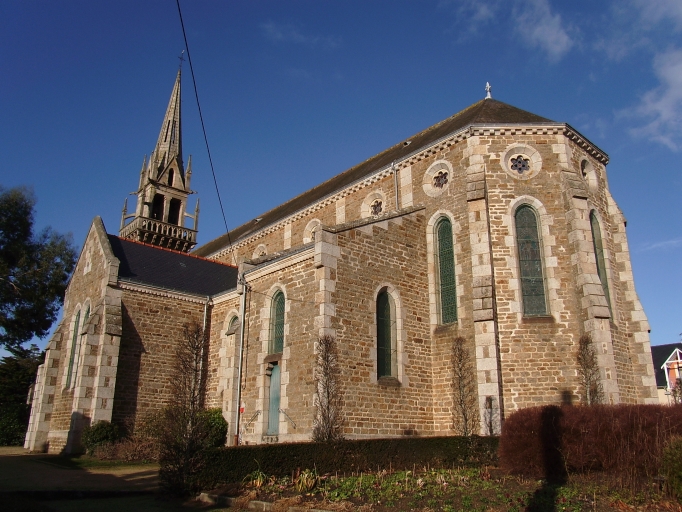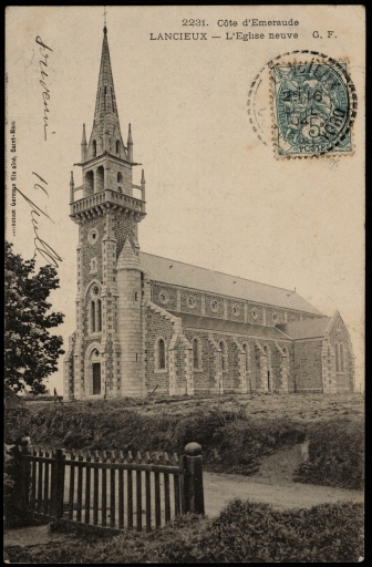 La nouvelle église paroissiale de Lancieux est un édifice orienté de style éclectique à trois vaisseaux et à volumétrie importante construit en granite sur un plan en croix latine. Le style, qualifié tantôt de " style dit de transition " par le maître-de-l'oeuvre, tantôt de " style XIIIème siècle " par René Couffon, associe le néo-roman (décor, chapiteaux), le néo-gothique breton (clocher) et le néo-gothique national (volume, voûtement, rosaces). L'édifice, dont l'élévation ouest est affirmée par une tour-porche carrée hors-oeuvre avec plate-forme à balustrade portant un clocher coiffé d'une flèche polygonale en maçonnerie, comprend une nef de cinq travées accostée de bas-côtés sur toute sa longueur, d'un transept et d'un choeur flanqué de chaque côté d'un bâtiment en appentis, dont celui de droite à usage de sacristie. Le couvrement de l'espace intérieur est formé par une voûte sur croisée d'ogives. Le chevet à trois pans présente à la base une pierre agrémentée du millésime 1900. La tour occidentale est flanquée d'une tour circulaire demi-hors-oeuvre enfermant un escalier en vis en maçonnerie desservant l'étage de cloches. Les pignons présentent des rampants à crossettes. Le gros-oeuvre est construit en moellons de granite équarris laissés apparents, l'encadrement des baies, les chaînes d'angles, la tour d'escalier, le clocher et la flèche en maçonnerie sont édifiés en pierre de taille de granite à ton clair (grand appareil).