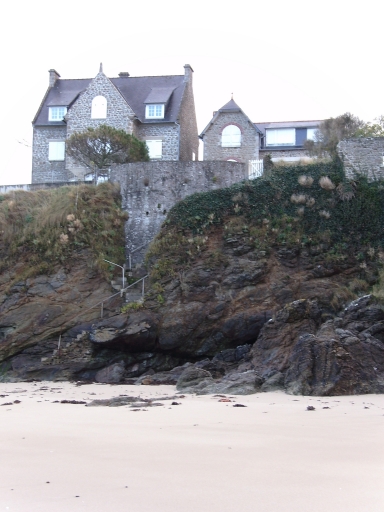 Maison avec vue sur mer construite en moellons de granite laissés apparents. La façade antérieure sur rue et la façade postérieure sur mer présentent une avancée latérale à pignon coiffée d'une demi-croupe. Éléments de décor : baies en plein-cintre, brique (couvrement de baie, bandeau), épis de faîtage en terre-cuite.
