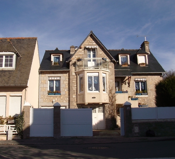 Maison à accès antérieur central composée d'un rez-de-chaussée, d'un étage carré et d'un étage de comble. La façade antérieure sur rue présente une avancée latérale à pignon agrémentée d'un bow-window à balcon en surplomb. L'entrée est protégée par un auvent. La travée de gauche a été rapportée.