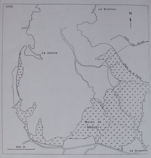 Par acte passé devant les notaires de l'Abbaye de St-Jacut-de-la-Mer le 17 mars 1742, les religieux de l'Abbaye afféagèrent à M. Desmarais, inspecteur des Ponts et Chaussées de Bretagne, des marais situés dans la paroisse de Lancieux et dans celle de Ploubalay. L'inspecteur se proposait d'assécher ces terrains et de les mettre en culture. A son décès, ses héritiers dont l'abbé Desmarais, recteur de Lancieux (1720-1749), se trouvèrent dans l'impossibilité d'assumer le financement des travaux. Par acte du 18 juin 1748, ils s'associèrent à messire Louis Péan de Pontfily, seigneur de la Roche. Aux termes de cet acte, M. de Pontfily s'obligeait à faire construire à ses frais des digues, à creuser les canaux nécessaires et à faire tous les ouvrages pour rendre les terrains propres à la culture. La plus grande partie de ces travaux fut achevée en 1749. Ces renseignements sont fournis par un arrêt du Parlement de Bretagne en date du 30 mars 1753. Cet arrêt mentionne que, dans la paroisse de Lancieux, cent journaux de terre (48 ha) furent asséchés grâce à cet endiguement et qu'ainsi. M. Péan et ses associés étaient tenus de payer, pour les terrains ensemencés, la dîme à la trente-sixième gerbe aux recteurs de Lancieux et de Ploubalay. Cette digue, également appelée 'Levée de terre' est constituée de deux parties séparées par une ancienne saline. De nombreux petits ouvrages liés au circuit des eaux douces et des eaux salées ont été repérés dans le marais et les polders : écluses ou 'noques', petits ponts de pierre ou en ciment. A remarquer cependant que l'ancien pont Montvoisin a été emporté lors de la tempête de 1929.