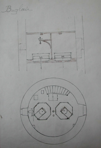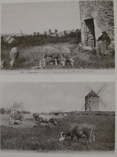 Le moulin à vent de Buglais (moulin non jumelé à un moulin à eau) est daté du 16ème siècle (cité dès 1574, AD 22, série E). Il était la propriété de l'Abbaye de Saint-Jacut qui possédait en outre à Lancieux, les fermes de Buglais et de la Briantais, situées sur la baie de Lancieux. Pour accéder au moulin, les moines devaient d'abord traverser la baie à marée basse et ensuite emprunter le chemin qui reliait la Briantais à l'Anerie en passant par les Aires du Tertre où il croisait le 'chemin Poissonnier'. A la Révolution, les possessions de l'Abbaye furent vendues comme biens nationaux. Le moulin fut acheté par François Lhotelier le 4 mars 1791. Il passa aux mains de Mathurin Lemonnier, meunier à Lancieux, puis à son fils Auguste, également meunier, qui le légua avec ses autres biens à l'hospice de Dinan en échange de la création d'un hospice pour les nécessiteux de Lancieux. En 1875, il subit comme d'autres moulins une transformation totale. Il fut doté d'un mécanisme à double meule et à rouage en fonte, pour faire tourner de grandes meules. Vers 1924-25, l'hospice de Dinan fit procéder à une vente aux enchères du moulin à la mairie de Lancieux. Il fut adjugé à la famille Jouët, dont le gendre François Chapelle l'exploita jusqu'aux années 1950, avant d'être écrasé par sa machine. Le moulin utilisait encore la force du vent en 1926, avant de recevoir un moteur à gaz d'appoint (gaz pauvre). Pendant la dernière guerre 1939-45, il était actionné par une machine à vapeur. Les cultivateurs de la région allaient y faire moudre leur grain. Le moulin est acheté par la commune de Lancieux en 1973. En 1976, il est restauré extérieurement par l'amoulangeur Jean Peillet, sous la direction des Bâtiments de France (maçonnerie, toiture, charpente). C'est également ce dernier qui refit à l'identique le chariot avec cabestan, pour déplacer le châssis mobile. Cette restauration fut complétée en 1990 par la remise en état du mécanisme intérieur : arbre, ailes (24 m d'envergure), potence, trémie, bluterie et deux paires de meules originelles, l'une pour le froment et l'autre pour les céréales secondaires. L'une de ces meules porte la date de fabrication, 1874, ainsi que les initiales du meunier de l'époque : G. C. Le témoignage historique de l'ancien amoulangeur Jean Peillet - qui a connu le dernier meunier et a vu fonctionné le moulin - permet de mieux comprendre le fonctionnement du moulin au milieu du 20ème siècle. Cependant, le moulin de Buglais, malgré son bon état de fonctionnement, ne fait plus tourner ses ailes depuis une quinzaine d'années.
