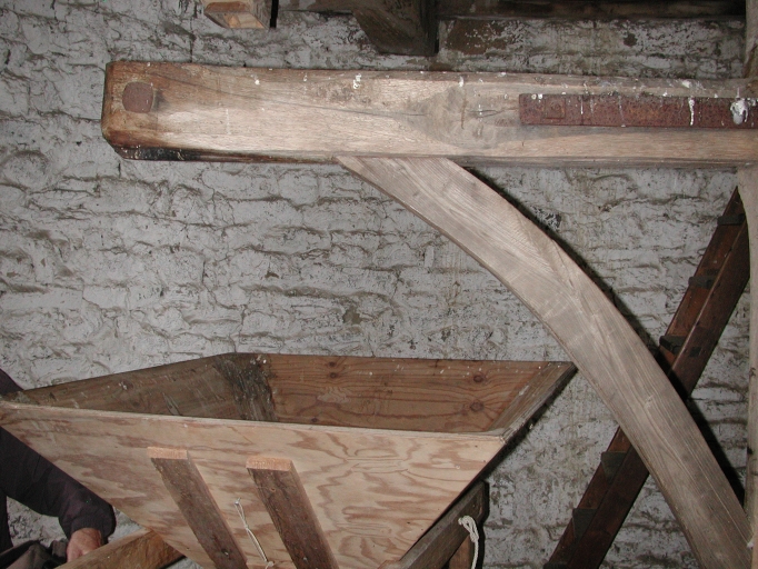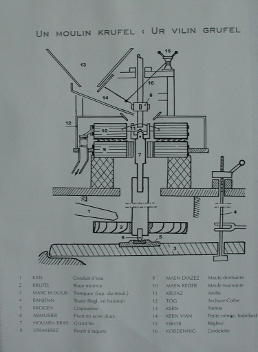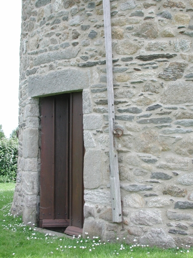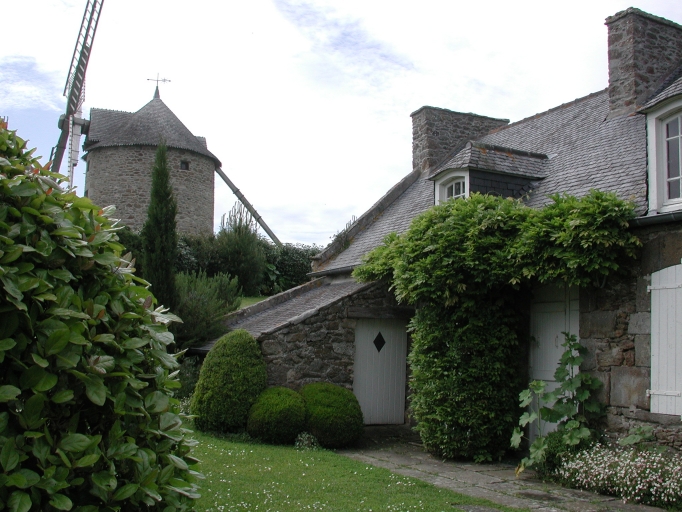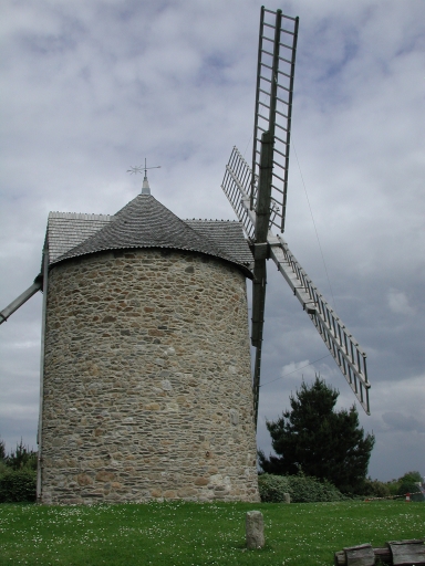 Le bâtiment, de forme centrée, dispose d'une forte assise au sol, avec un certain empâtement. Le moulin est construit avec une maçonnerie en granite, schiste, gneiss et pierre de Saint-Cast. Les murs intérieurs du moulin ont été récemment blanchis à la chaux. Le moulin a un seul étage, dit 'étage des meules', avec les rouages satellites de la bluterie au rez-de-chaussée. Le dernier étage sous combles comprend l'arbre et le rouet, avec une petite ouverture pour observer la direction du vent et la lucarne appelée 'houteau' qui reçoit le frein et la queue du moulin (pour orienter la charpente mobile au vent). La couverture est réalisée en bardeaux de chêne, elle repose sur un châssis tournant porteur de l'arbre et du rouet d'entraînement. Le moulin est équipé depuis le 19ème siècle d'un régulateur à boules, inventé par James Watt, fixé sur une potence en bois, qui renvoie par un levier des cercles pour soulever les meules et éviter ainsi l'emballement du moulin. Les meules actuelles datent du 19ème siècle. Elles portent encore la marque du fabricant (une rosace), en provenance de Brie en Champagne. Ce commerçant exportait ses meules sous forme de morceaux de plâtre. L'amoulangeur se chargeait alors de les assembler sur place. Dans l'inventaire d'un moulin, les meules valaient l'équivalent des 2/3 de son équipement. Les meules de ce moulin, de grand diamètre (145 cm) sont montées 'à 'l'anglaise' (verticalement).